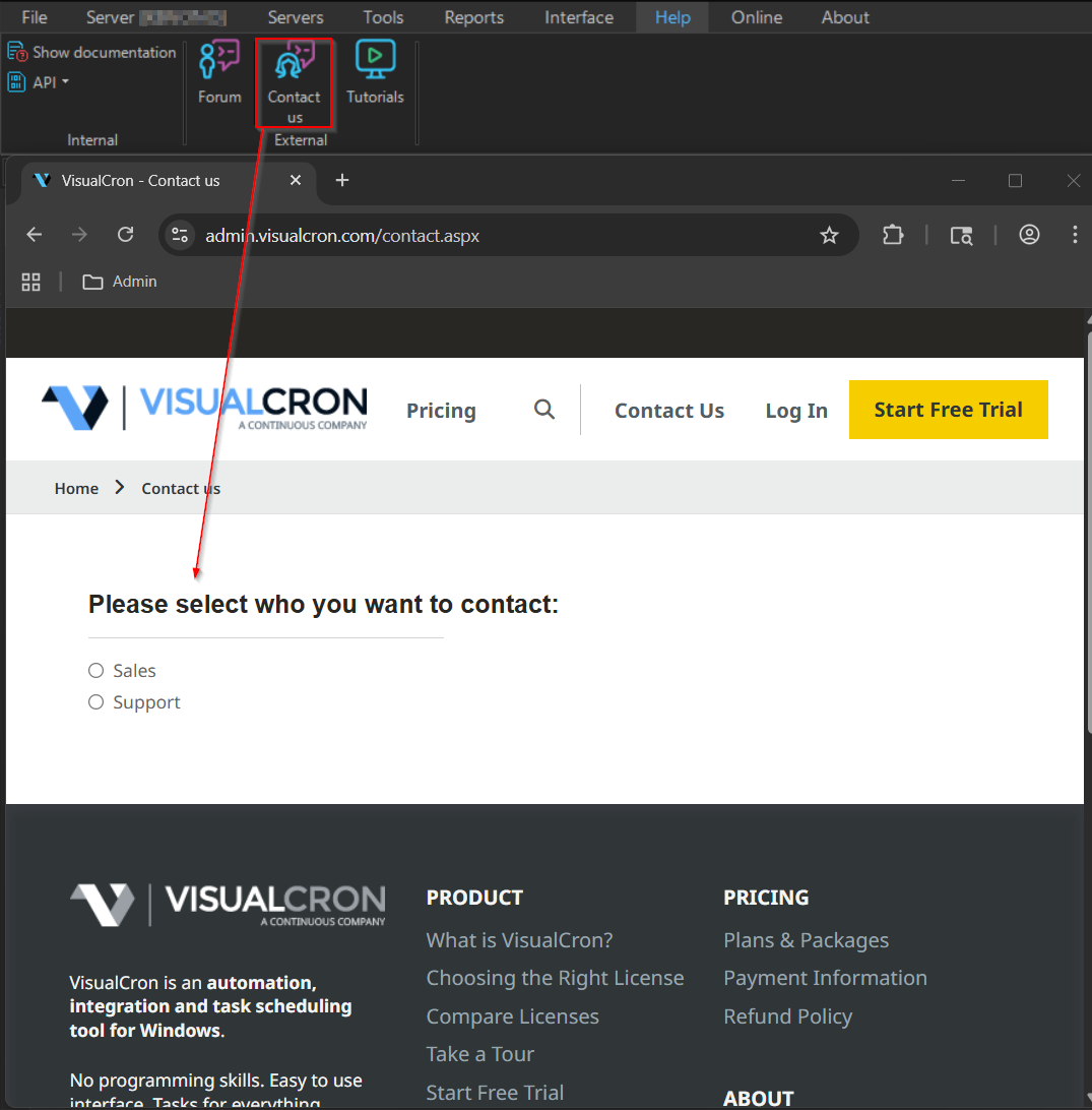 The main menu Help > External > Contact us option opens a new web browser window to the VisualCron Contact web page.