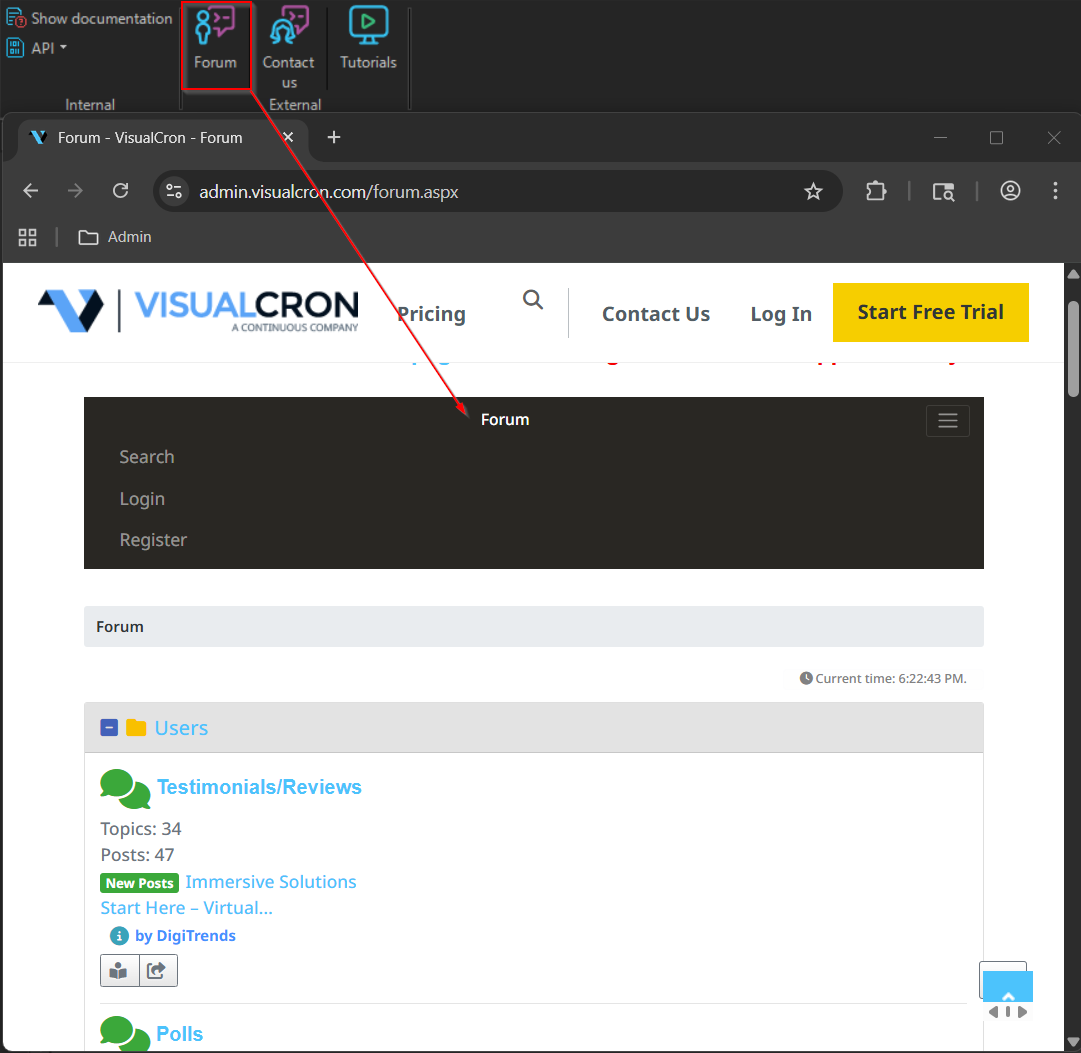 The main menu Help > External > Forum option opens a new web browser window to the VisualCron users/tutorials/support/development discussion forum web page. We encourage you to use this forum e.g. for testimonials, problem solving or feature requests.