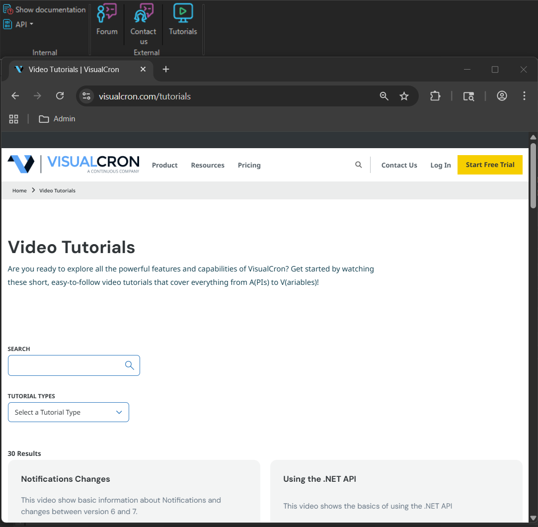 On this pageExternal - TutorialsThe main menu Help > External > Tutorials option opens a new web browser window to the VisualCron Demos web page.
