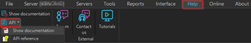 With the main menu Help > Internal > API option, you can select either the Show documentation (in PDF format) or the API reference window.