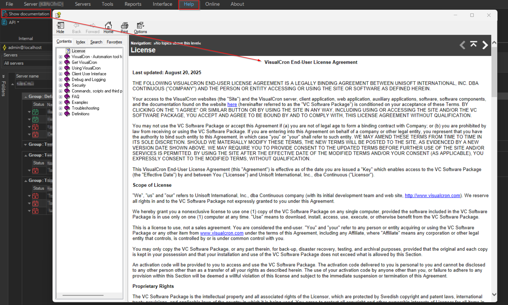 The main menu Help > Internal > Show documentation option opens the VisualCron Help dialog provided with the VisualCron installation.
