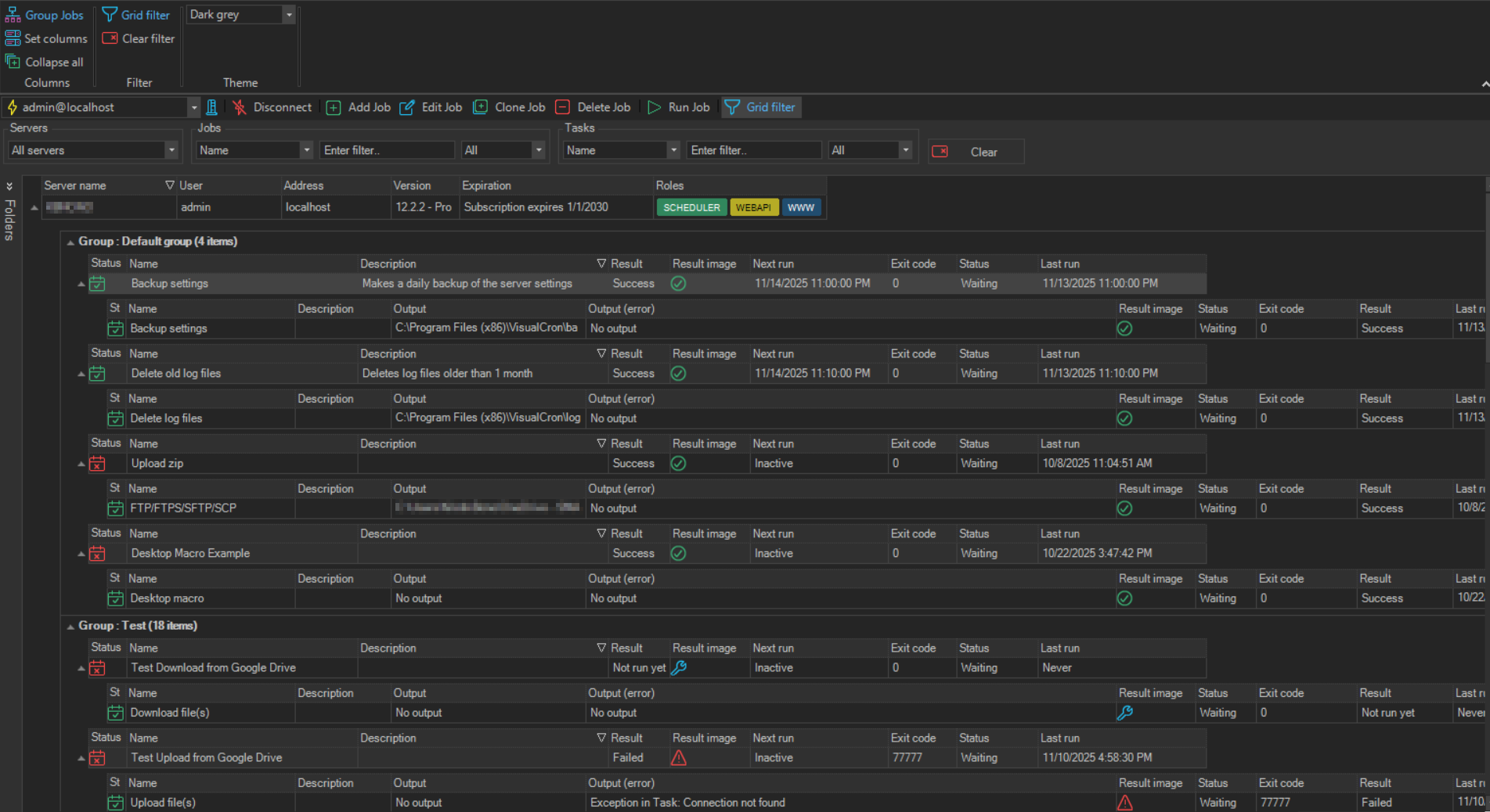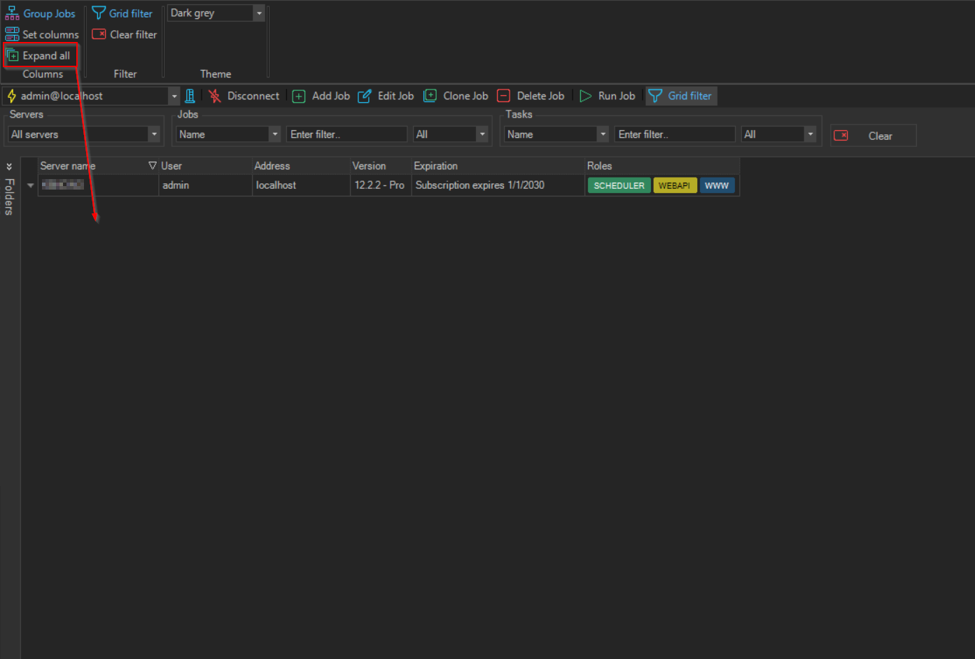 The main menu Interface > Columns > Expand all option operates in the Server/Group/Job/Task grid and "Expand all" or "Collapse all" Jobs/Tasks related to a specific server.