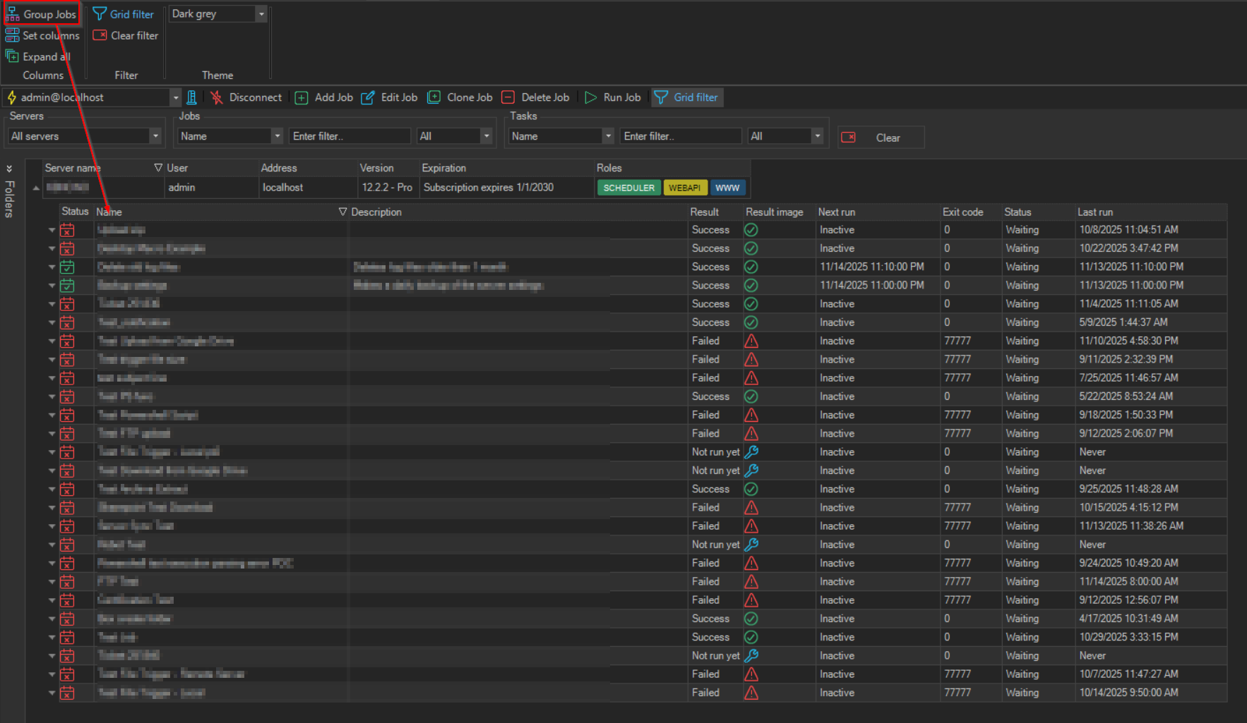 With the main menu Interface > Columns > Group jobs option, it is possible to expand or compress to Jobs the Servers/Groups/Jobs/Tasks grid.