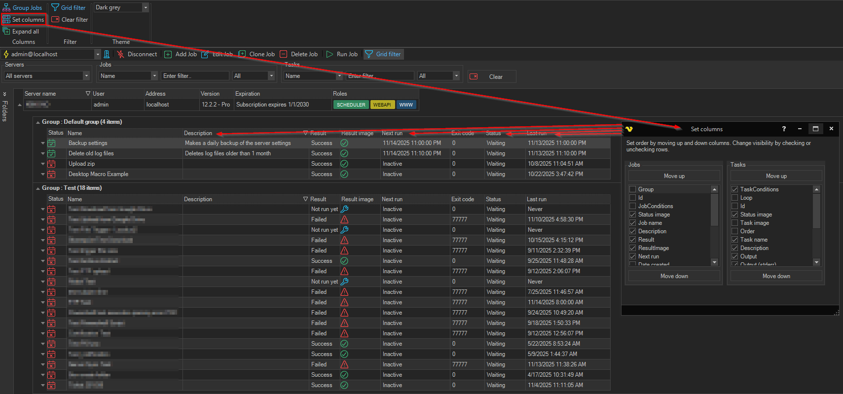 With the main menu Interface > Columns > Set columns option, each available Job/Task column can be set to visible/invisible and also the order of columns (from left to right) can be changed. All changes have immediate effect in the Server/Group/Job/Task grid.