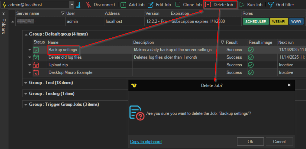 When a Job is defined, right-click on the Job or Task in the Server/Group/Job/Task grid and select Delete Job '<Job name>' to delete the Job. A Job, marked in the Server/Group/Job/Task grid, can also be deleted by the toolbar Delete Job button.