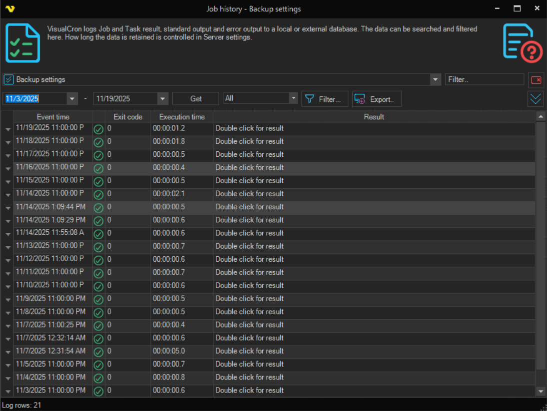 The data in this window is based on the local database file. The number of entries in this file is limited by the Job Log settings in Server > Settings > Log settings > Database settings.