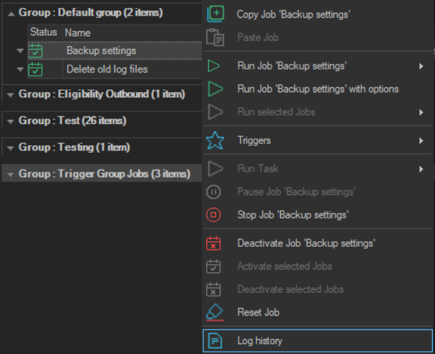 When a Job is defined, right-click on the Job or Task in the Server/Group/Job/Task grid and select Job log to open the log window.