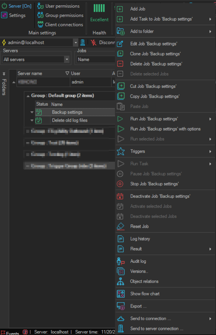 By mouse right-click on a Job in the Server/Group/Job/Task grid, Job related options are available. See list of Job and Task options in the Job List sub chapters.