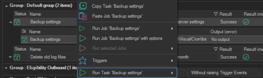 If a Task for a Job is selected and the Task is right-clicked in the Server/Group/Job/Task grid, the selected Task is run.
