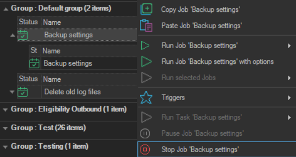 When a Job is defined, right-click on the Job or Task in the Server/Group/Job/Task grid and select Stop Job '<Job name>' to stop a Job that is currently executing.
