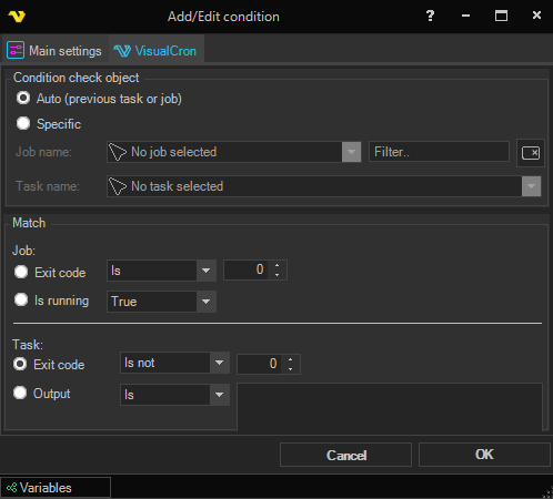 - Task Exit code - A successful run of a Task returns exit code 0. So, if you only want to run the next Task if the previous Task returned "Success" you select "Task exit code" - "Is" - "0". In the condition set where this condition belong, you select "Continue" in "MatchAll" and "Exit" in "MatchNone". Thus, if the exit code is "0" you will have one match and the action for "MatchAll" will be run. The action was continue which runs the Task it was supposed to run. If the exit code is not "0" (failure) it will not match your condition and therefore the action of "MatchNone" will be run. The action you specified was "Exit", which will terminate the current run of your Job.