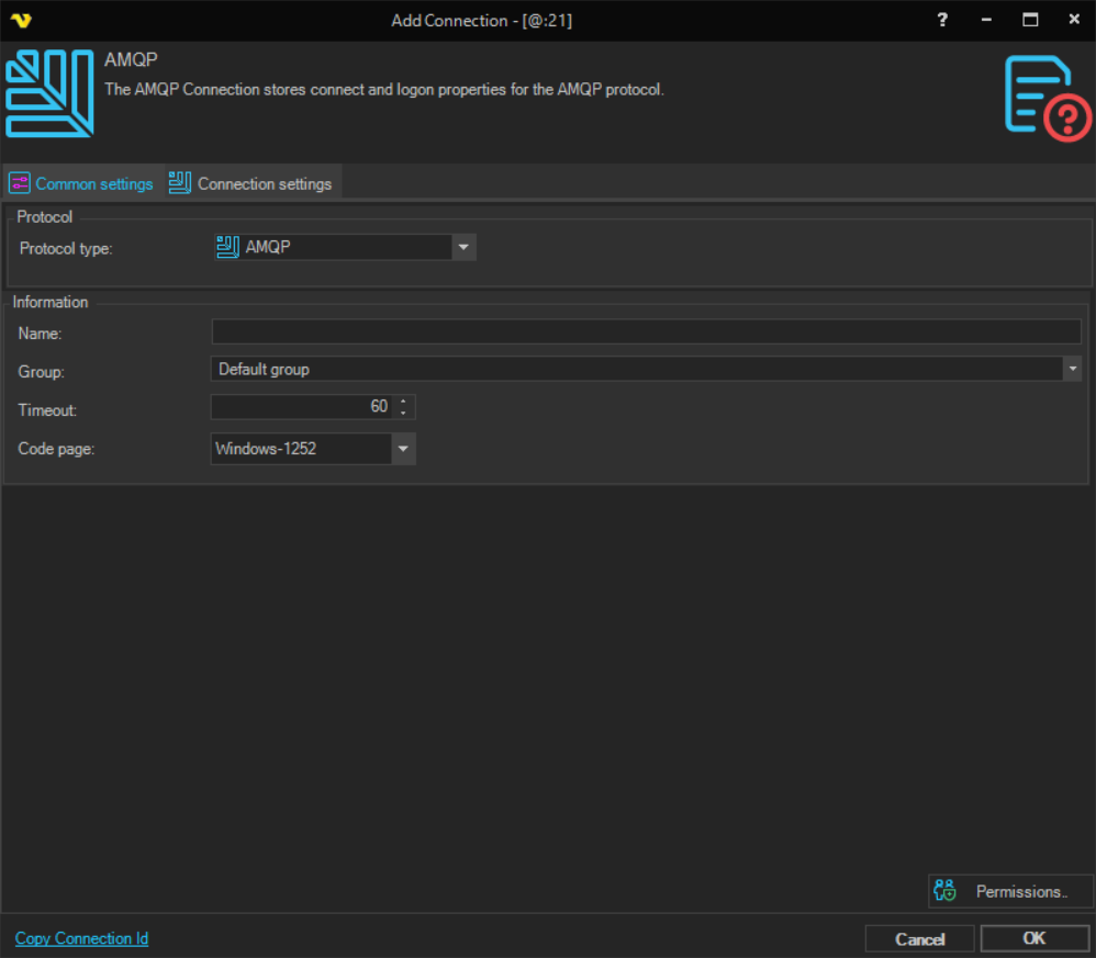 Manage Connections > Add > AMQP > Common settings tab