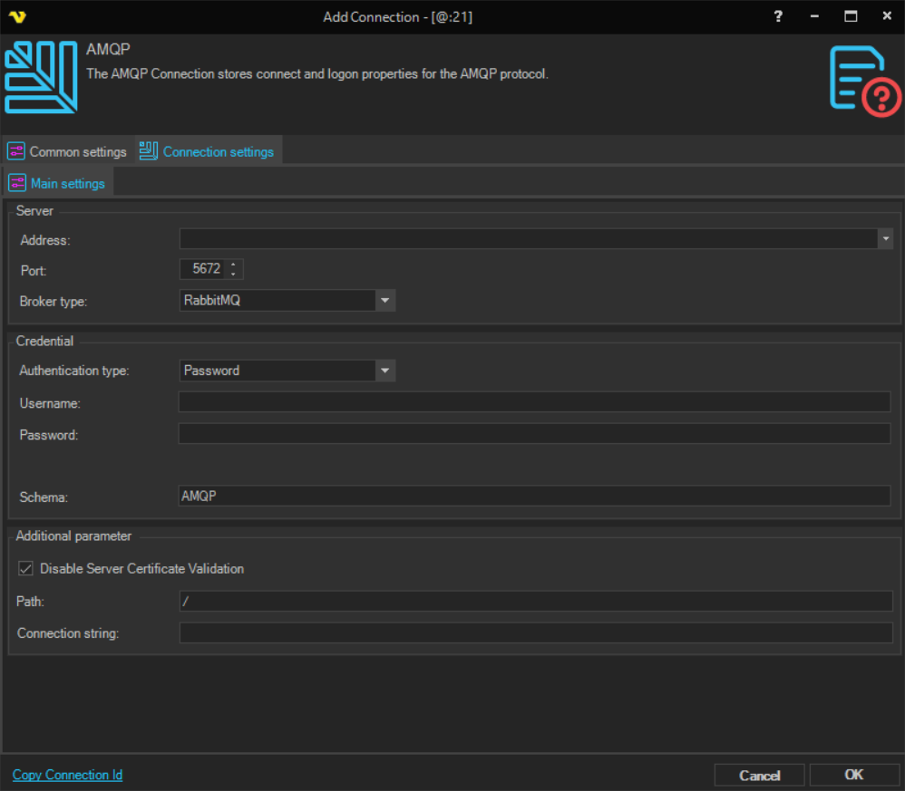 Manage Connections > Add > AMQP > Connection settings tab