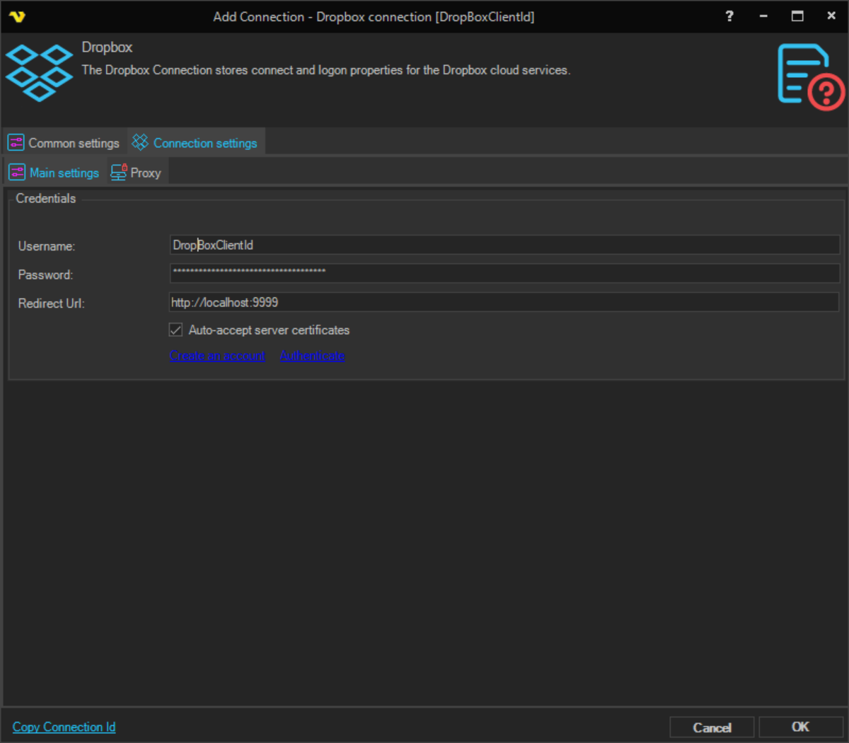 Manage Connections > Add > Dropbox > Connection Settings tab