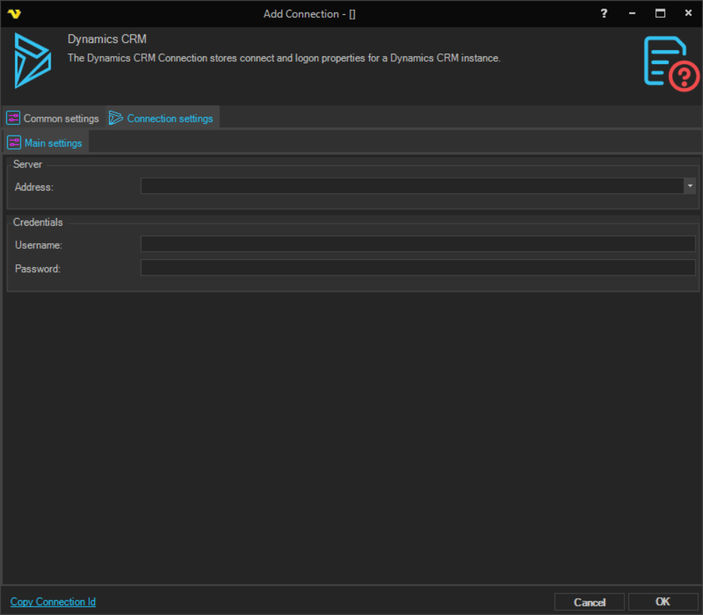Manage Connections > Add > Dynamics CRM > Main settings tab