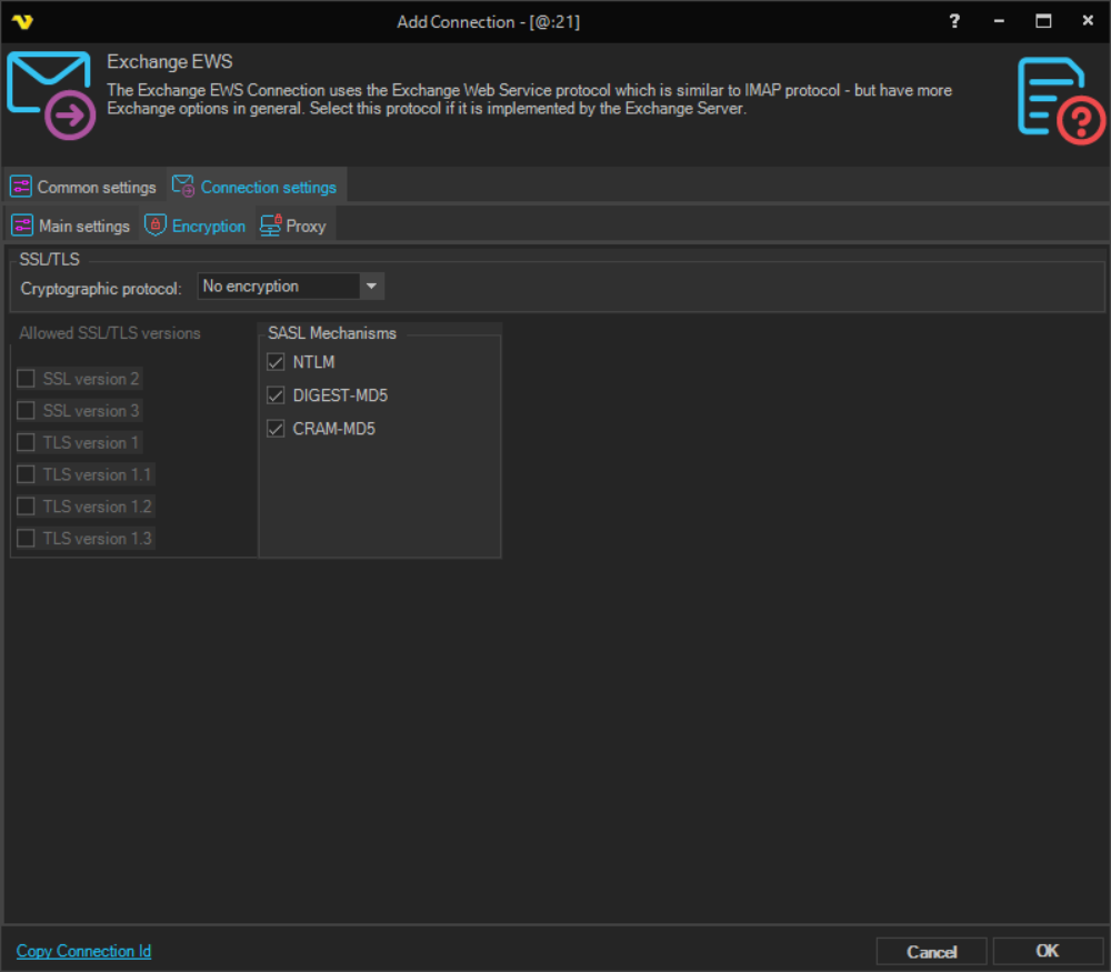 Manage Connections > Add > Exchange EWS > Encryption tab