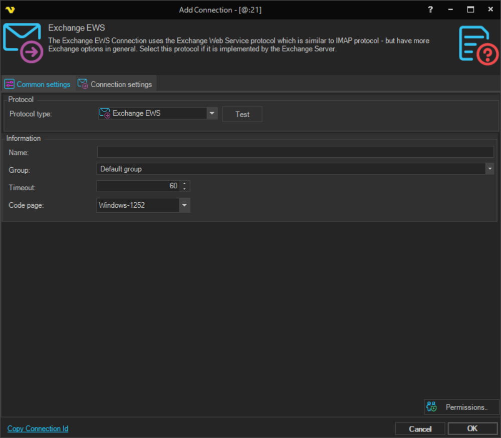 Manage Connections > Add > Exchange EWS > Common settings tab