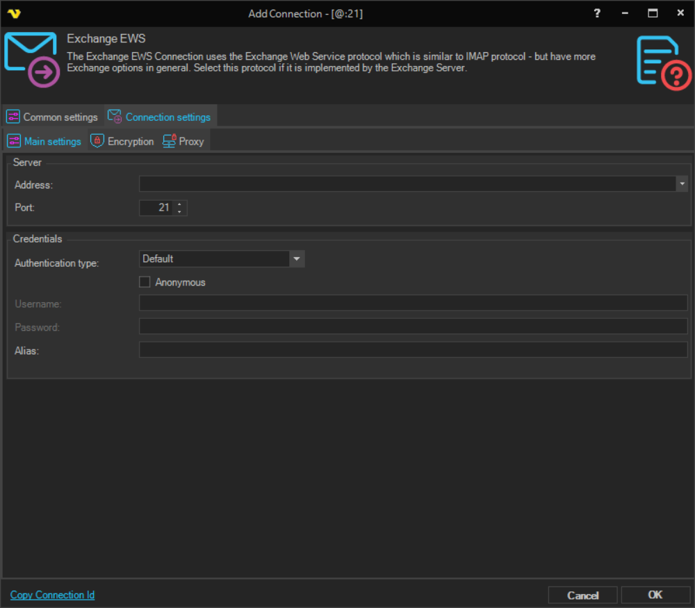 The Exchange EWS Connection uses the Exchange Web Service protocol which is similar to the IMAP protocol - but have more Exchange options in general. Select this protocol if it is implemented by the Exchange server.