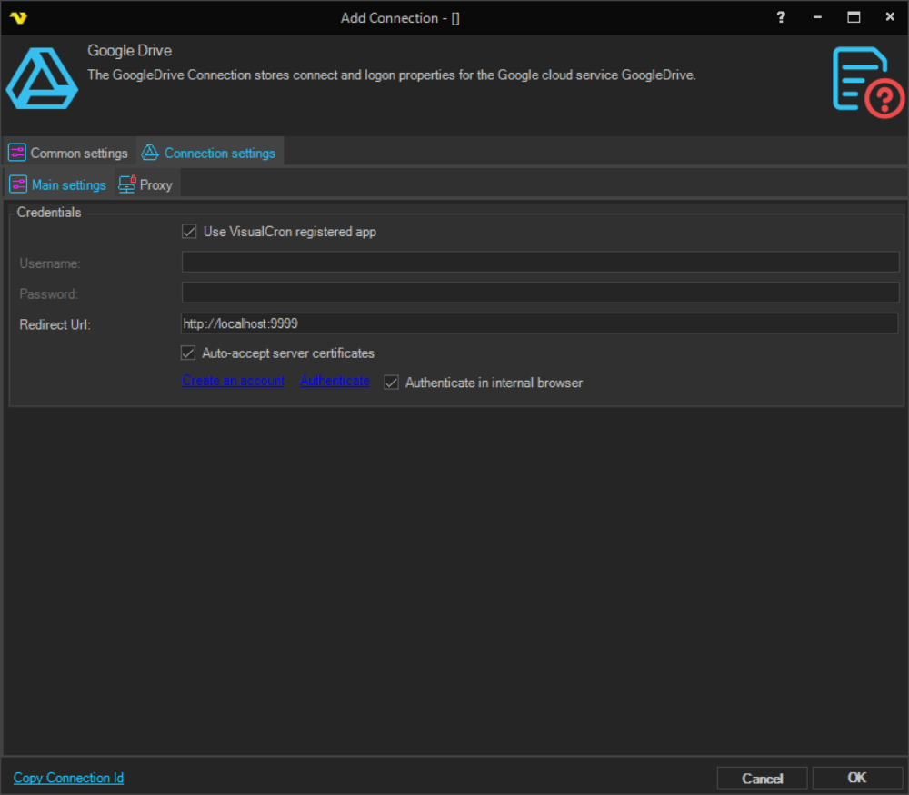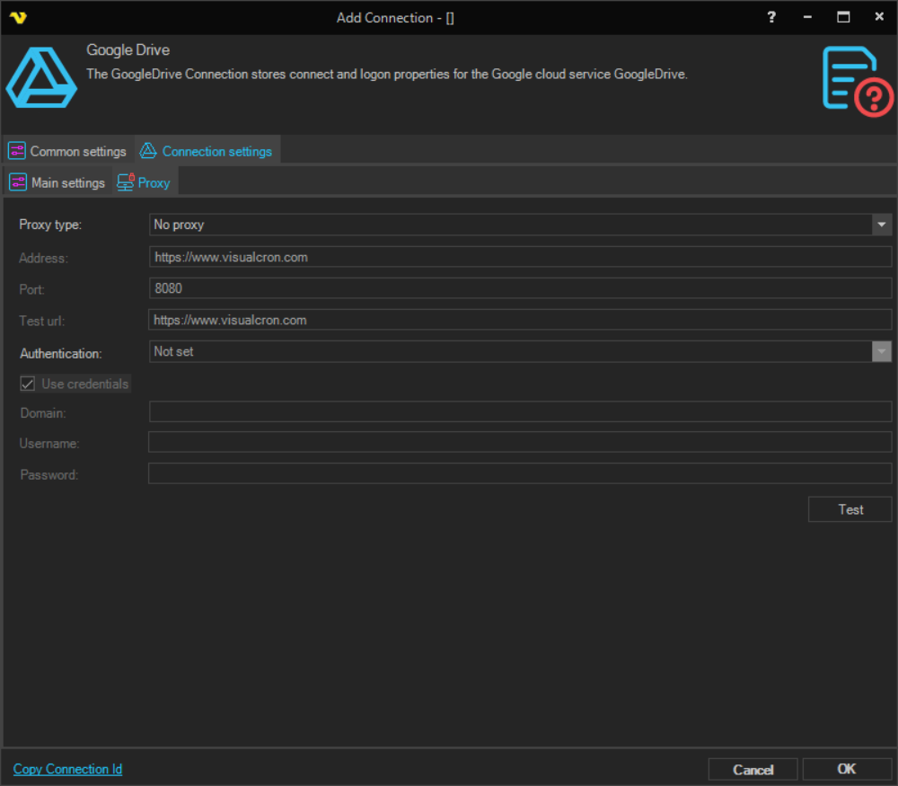 Manage Connections > Add > Google Drive > Proxy tab