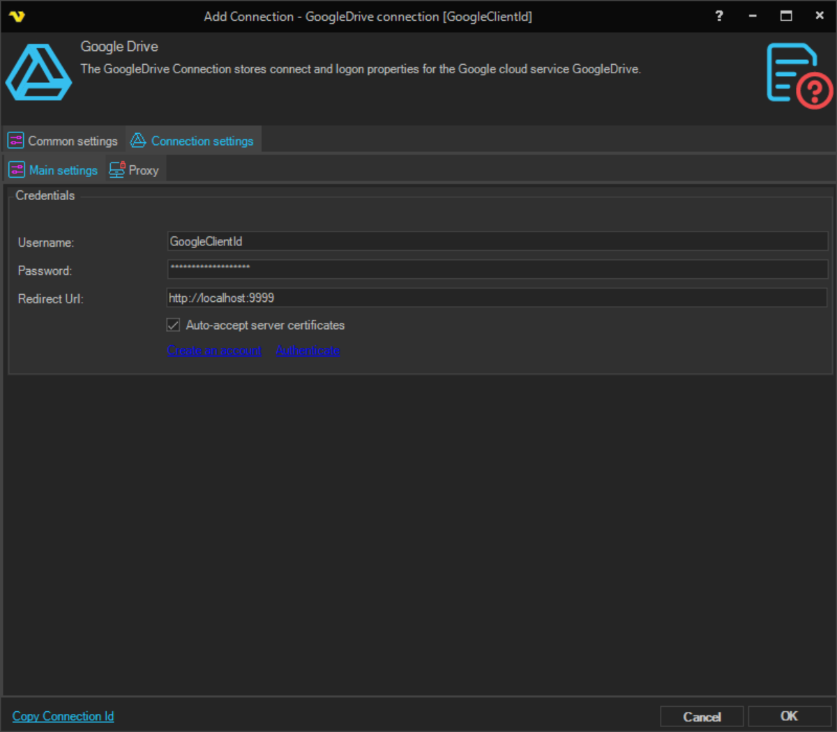 The Google Drive Connection stores connect and login properties for the Google cloud service Google Drive.