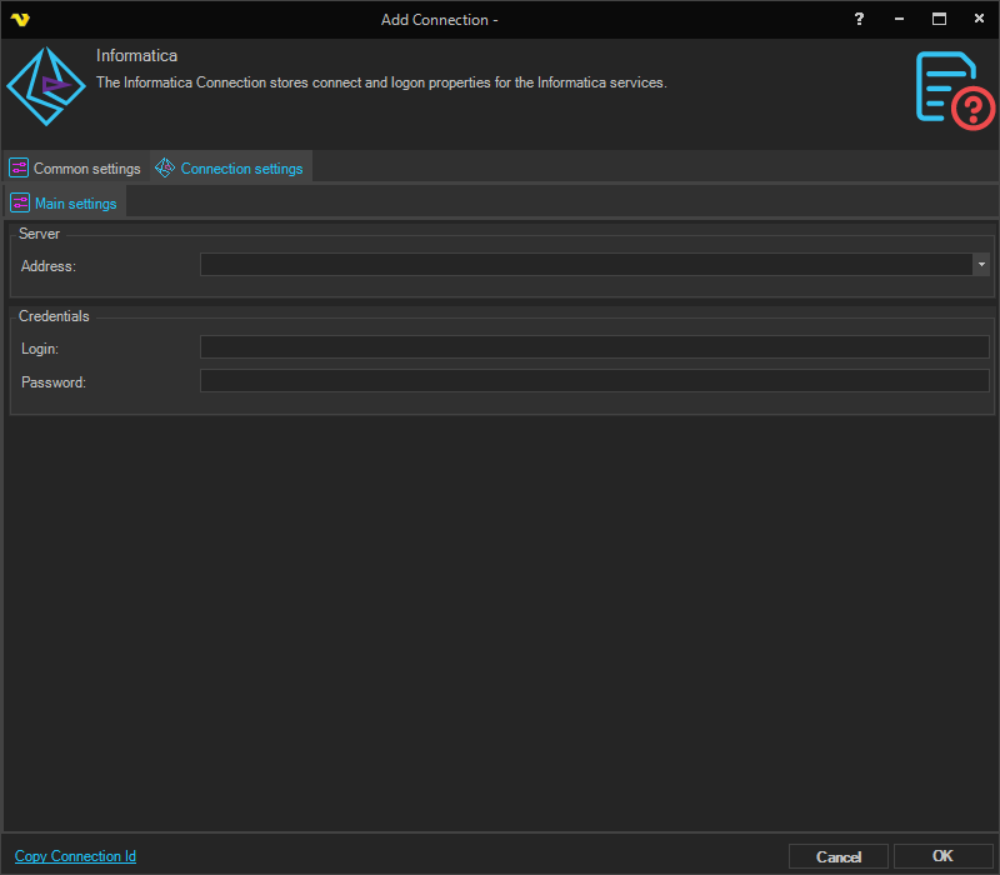 Manage Connections > Add > Informatica> Common settings tab