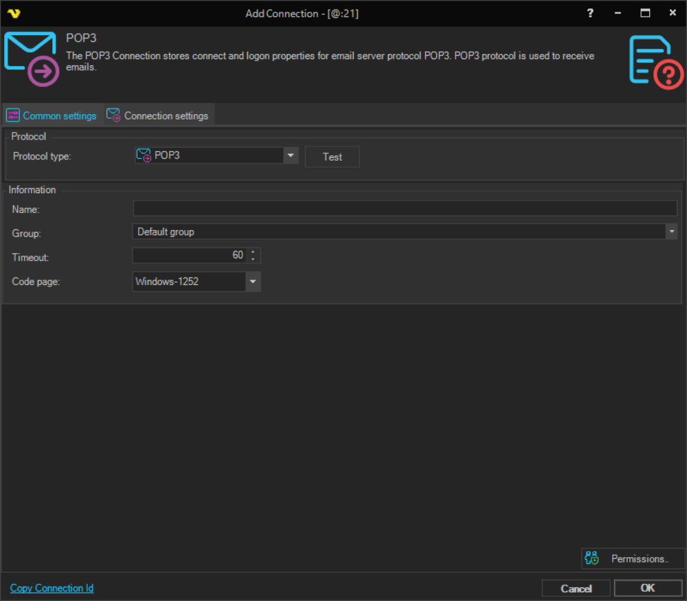 The POP3 Connection stores connect and logon properties for the email server protocol POP3. POP3 (Post Office Protocol 3) is used to receive emails from a mail server. It has largely been superseded by IMAP4 but is still widely supported. The POP3 Connection is used in the Email Trigger.