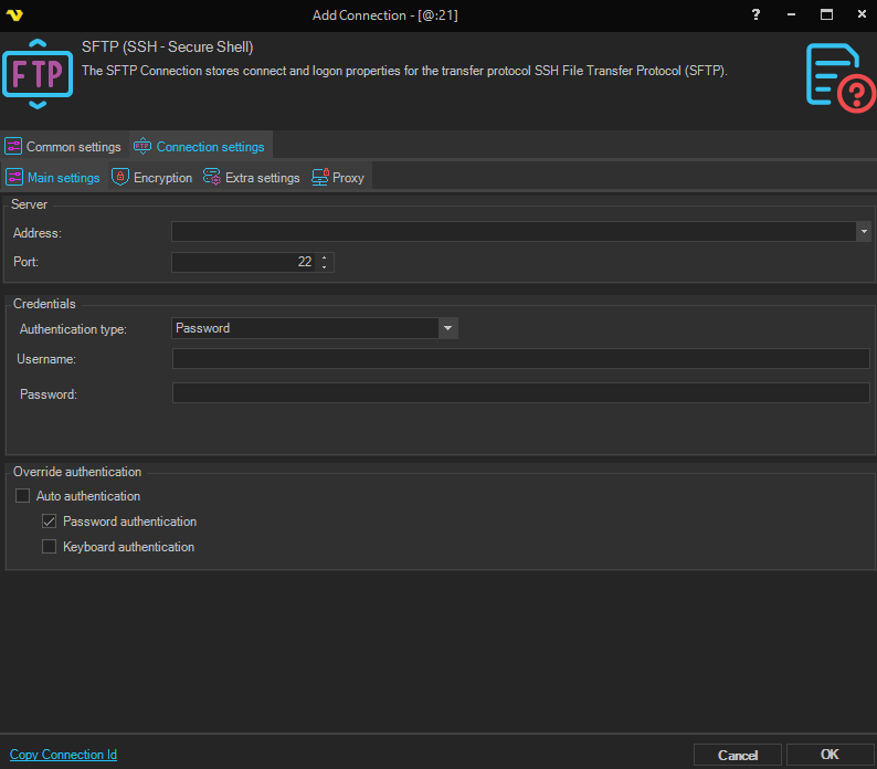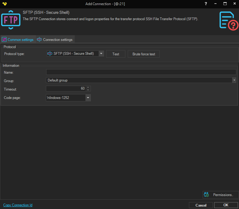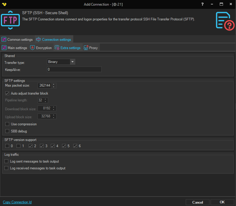 The SFTP Connection stores connect and logon properties for the transfer protocol SSH File Transfer Protocol (SFTP).