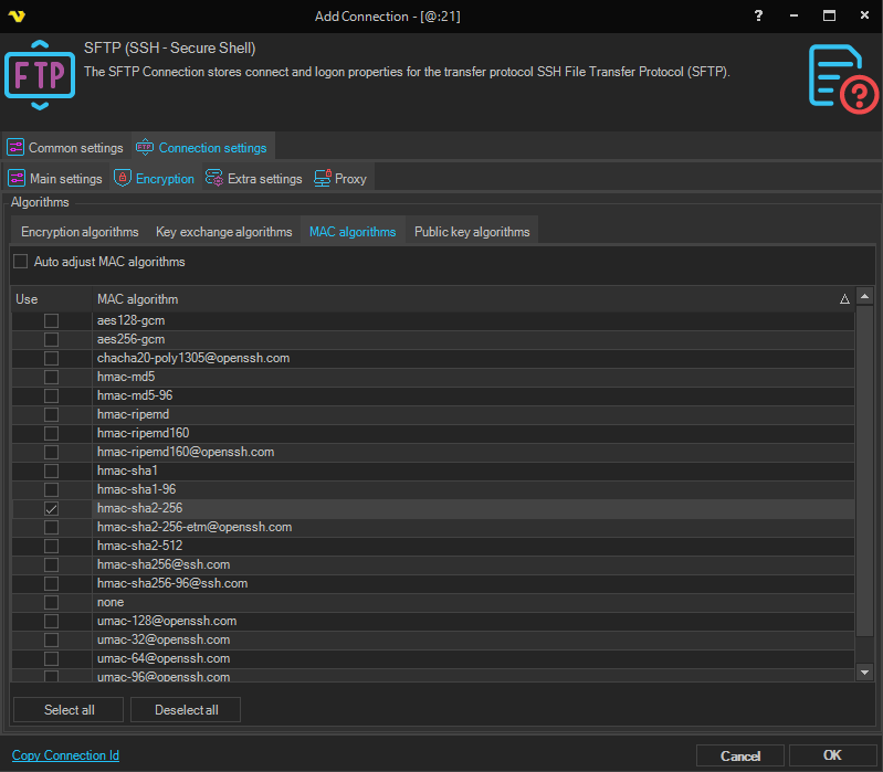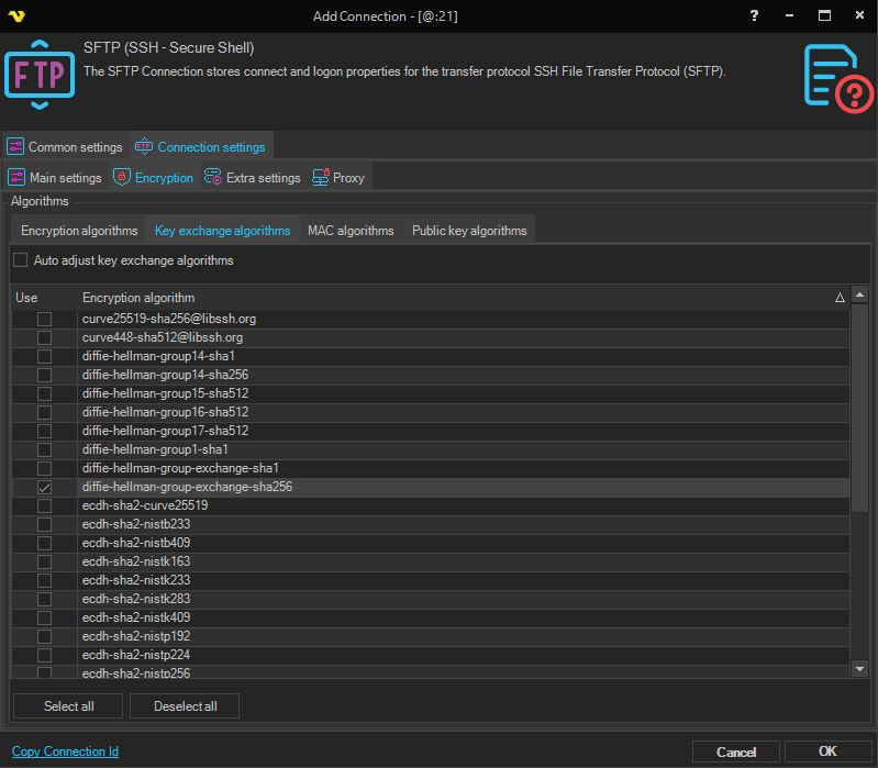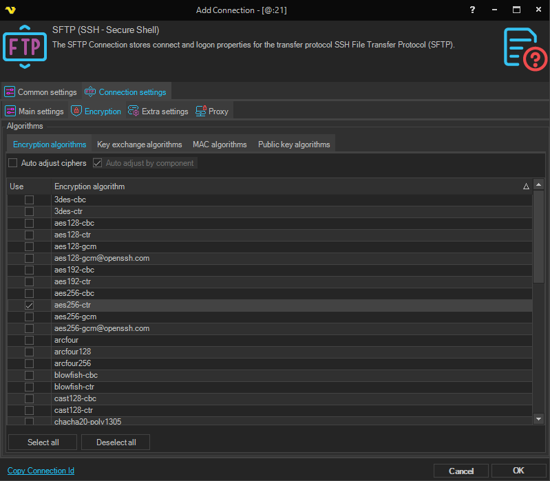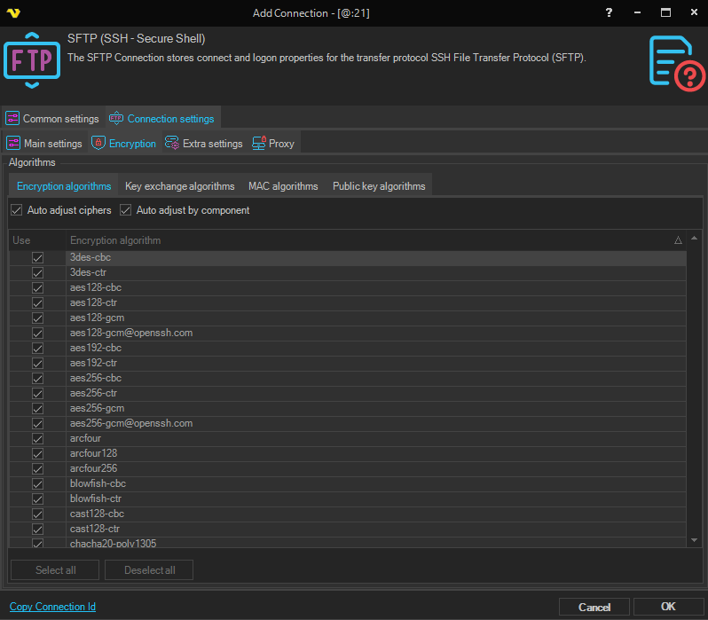 By default, these are auto-negotiated by VisualCron but sometimes the remote server does provide the proper information to VisualCron and you need to, in detail, adjust which algorithms should be used. For each encryption type you can check "Auto adjust ciphers". When checked, VisualCron will try to find the right setting. If you uncheck you can select yourself.