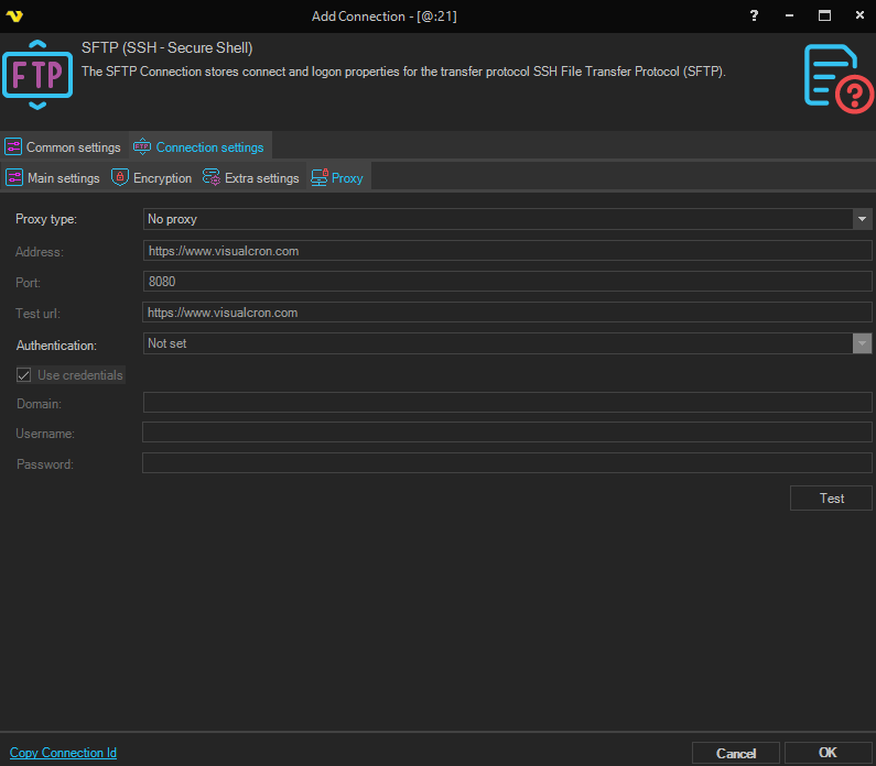Some SFTP servers require specific encryption settings for communication between client and server. Four types of encryption can be adjusted in VisualCron: