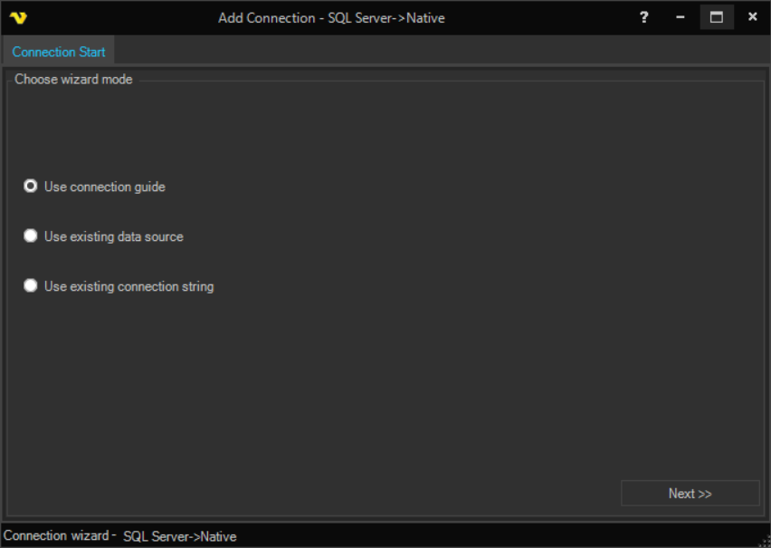 This starts the wizard which suggests connection strings depending on database and connection type.
