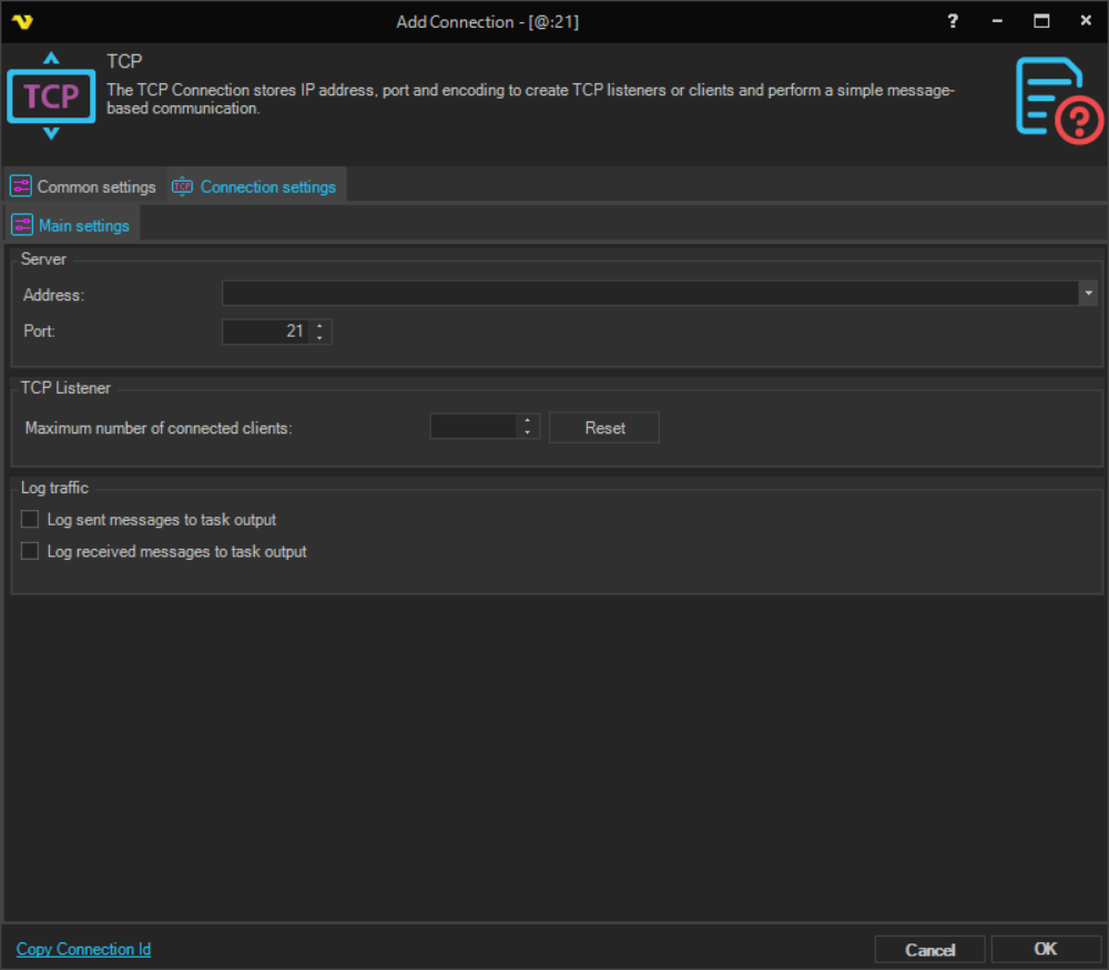When checked, all messages received by VisualCron from the remote TCP server are logged and stored in the Task output.