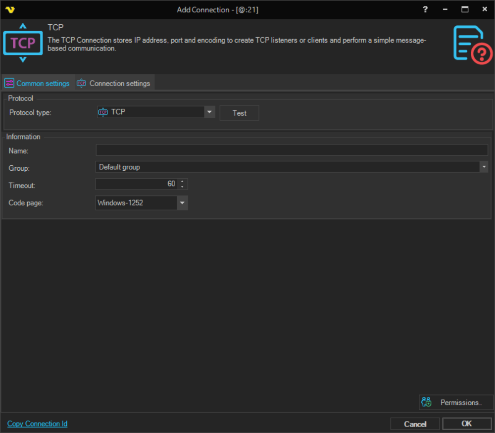 The TCP Connection stores the IP address, port, and encoding properties used to create TCP listeners or clients and perform simple message-based communication.