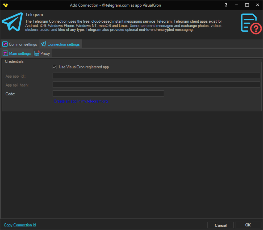 In VisualCron you have the option, in the authentication tab, to use the existing Telegram app "VisualCron". If you for some reason, want to use your own app, you need to create one here and then enter App app_id and App api_hash in authentication tab.