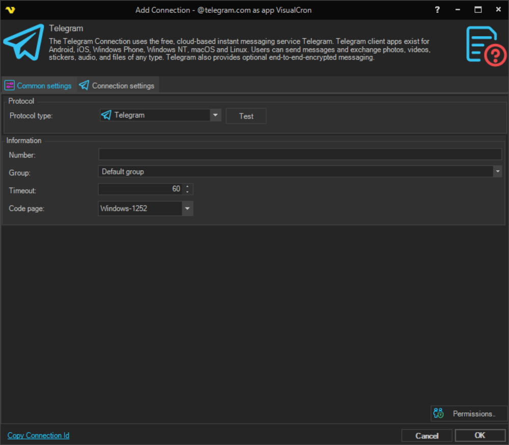 The Telegram Connection uses the free, cloud-based instant messaging service Telegram. Telegram client apps exist for Android, iOS, Windows Phone, Windows NT, macOS and Linux. Users can send messages and exchange photos, videos, stickers, audio and files of any type. Telegram also provides optional end-to-end encrypted messaging.