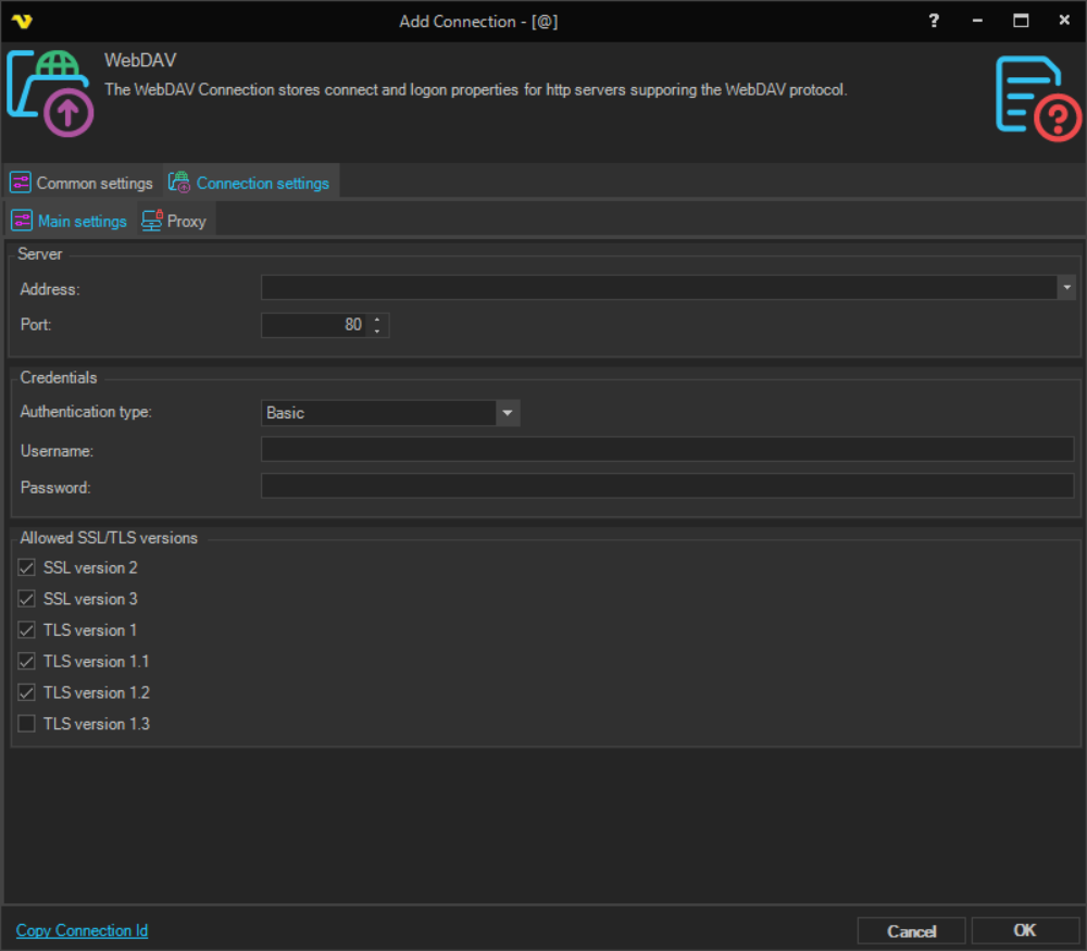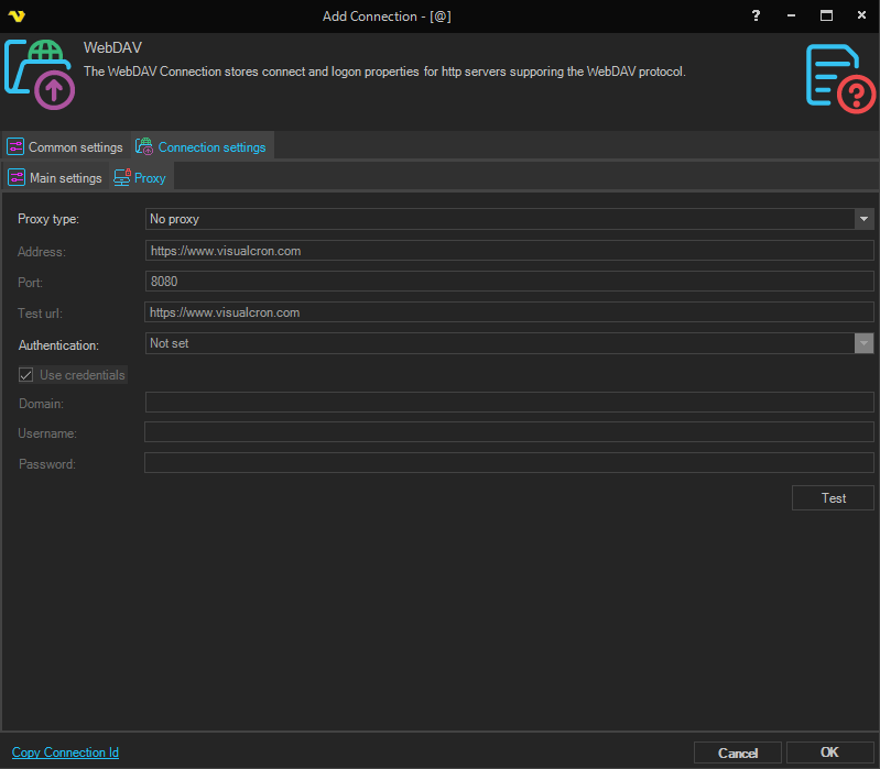 Manage Connections > Add > WebDAV > Connection settings > Proxy tab