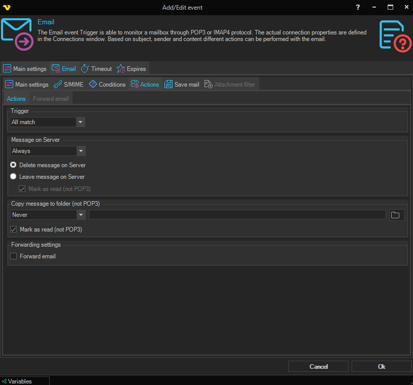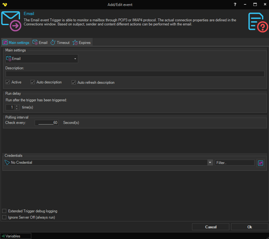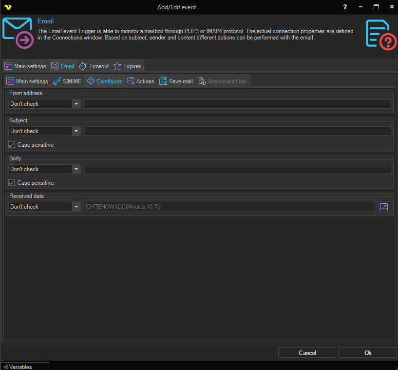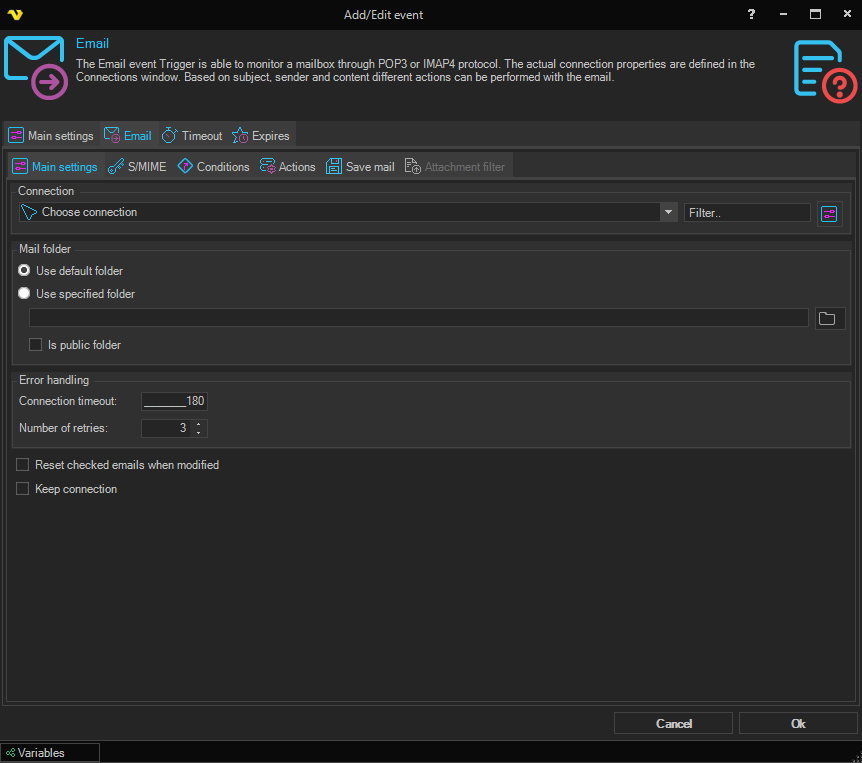 The Email event trigger is able to monitor a mailbox through the POP3 or the IMAP4 protocol. The actual connection properties are defined in the Connections window. Based on subject, sender and content different actions can be performed with the email.