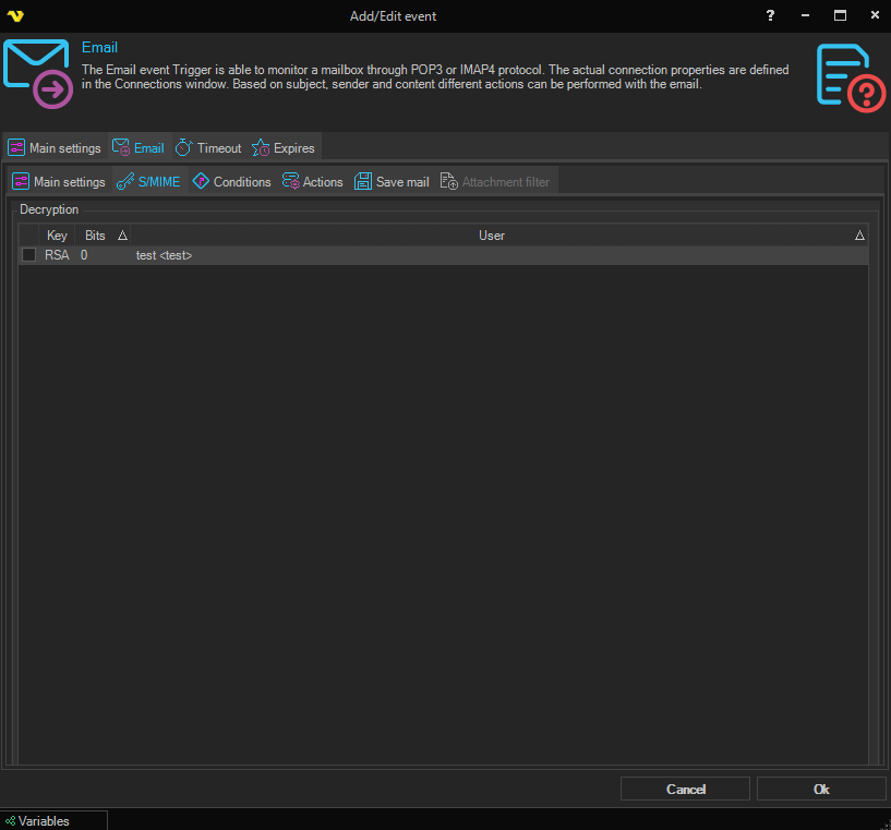 If the email is encrypted you need a Certificate to decrypt it. A certificate is often retrieved from the sender of the Certificate and is in the X509 certificate standard. Once you have created or imported a certificate you need to check it in the list. If an email is encrypted VisualCron will try to use that certificate for decryption.