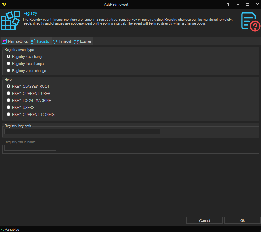 The Registry event trigger monitors a change in a registry tree, registry key or registry value. Registry changes can be monitored remotely, reacts directly and changes are not dependent on the polling interval. The event will be fired directly when a change occur.