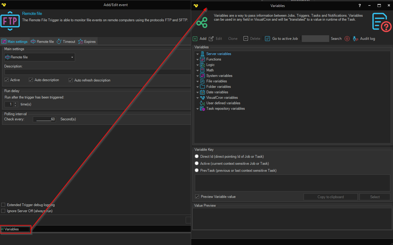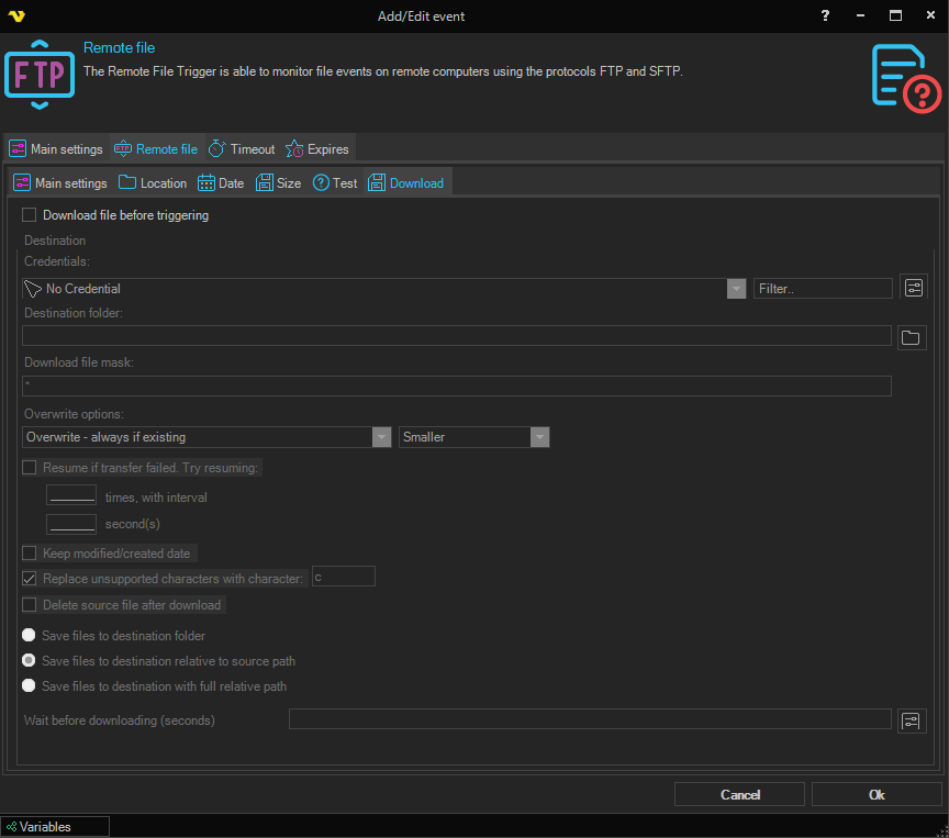Triggers > Add > Event Trigger > Remote file > Variables