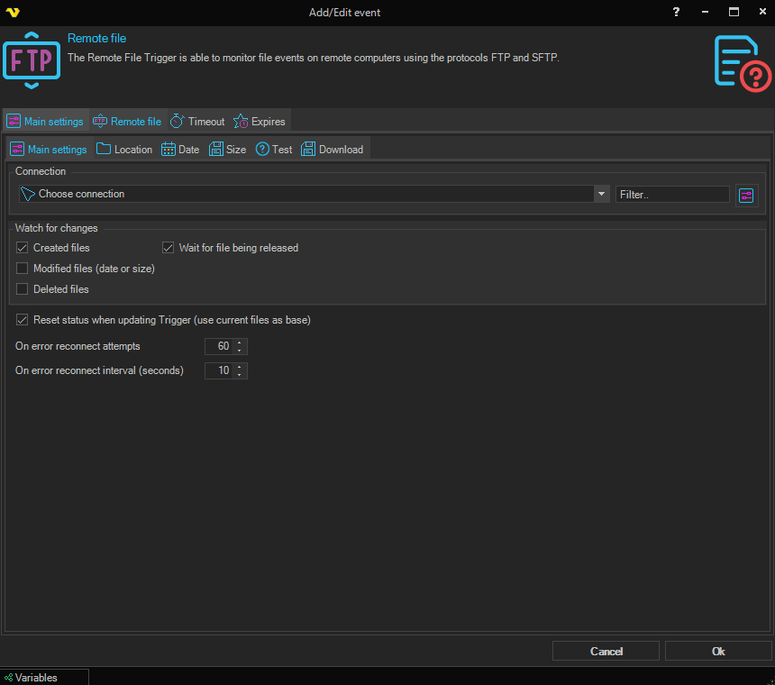 Let say the remote server you watch gets disconnected for some reason, perhaps the network or computer is down. The reconnect attempts value controls how many times VisualCron tries to reconnect. Default value is 3 times.