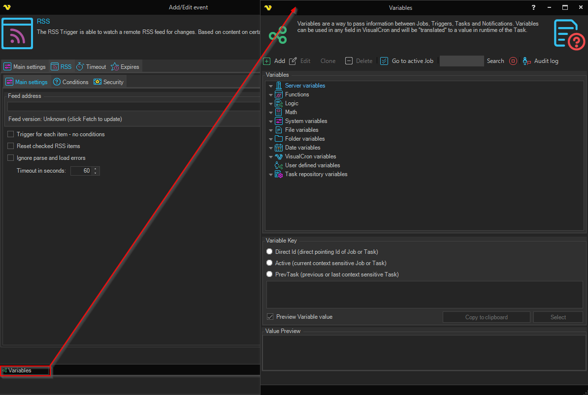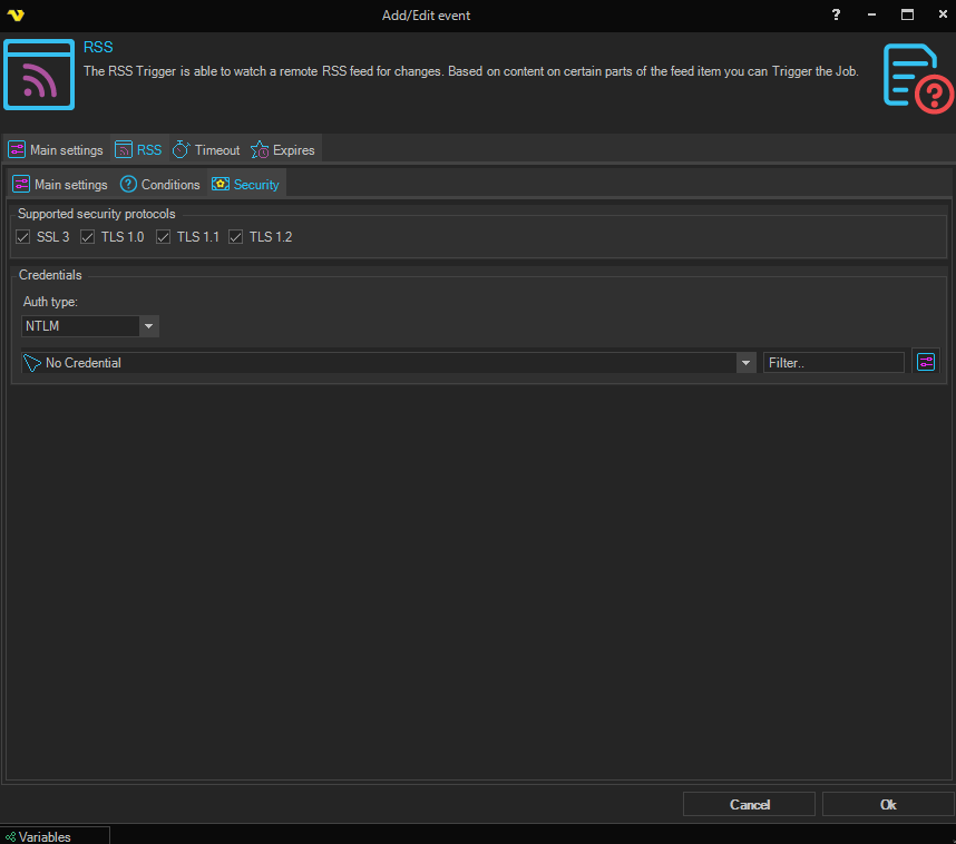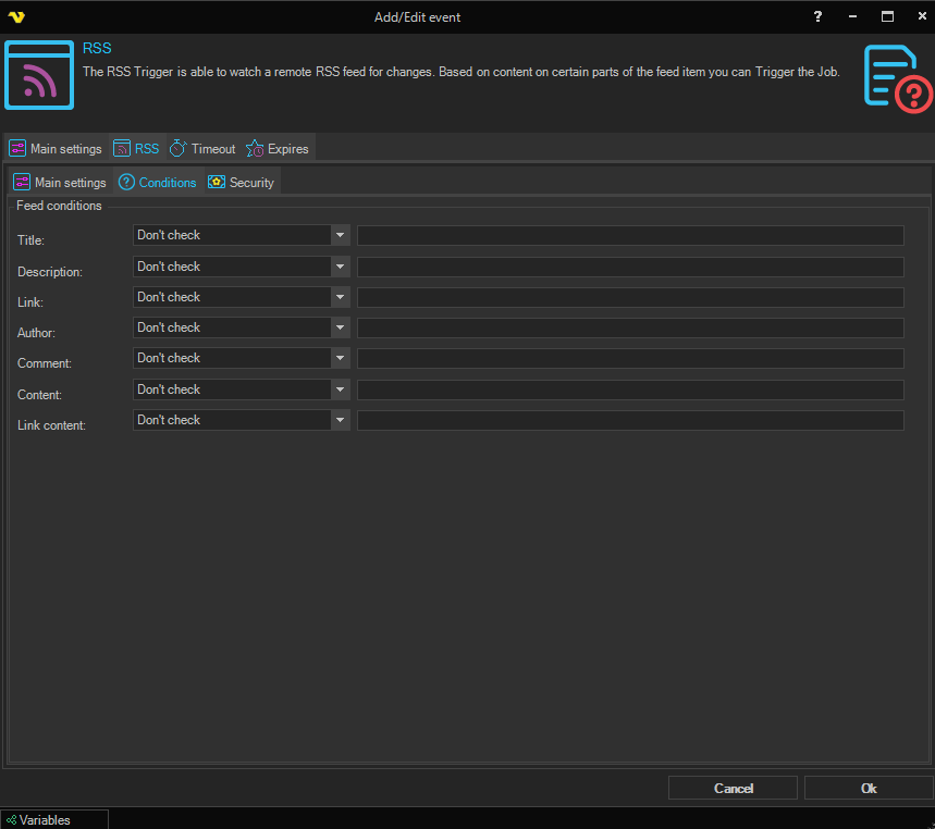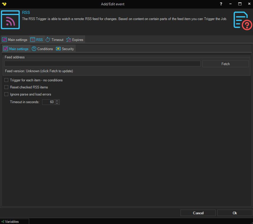 As for all event triggers we recommend that you set "Put Job in queue" in the man settings of the Job. This will force VisualCron to process one item at a time. For example, if you let your RSS Trigger check every 60 seconds and two new items has been added since last check - then VisualCron will Trigger twice. In order to be able to use Variables from the Trigger correctly "Put Job in queue" needs to be set otherwise a mixup of Variables is possible.