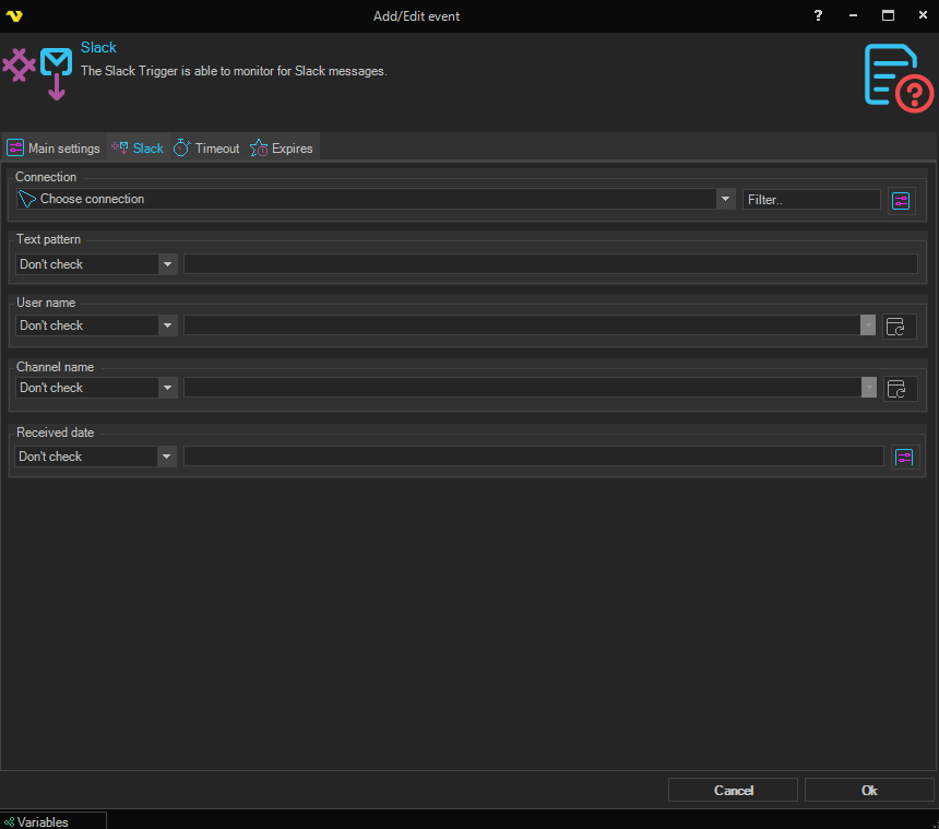 The Slack Event Triggers triggers on new messages in the Slack cloud. This Trigger is using the Slack Connection.