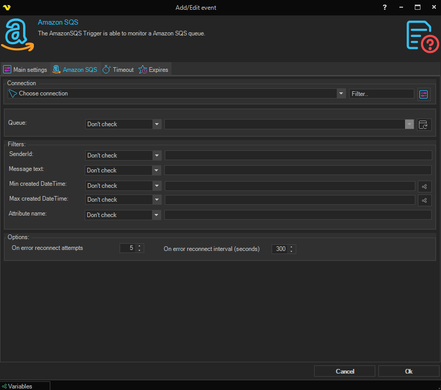 The Amazon SQS Trigger in VisualCron is using the Amazon Connection.