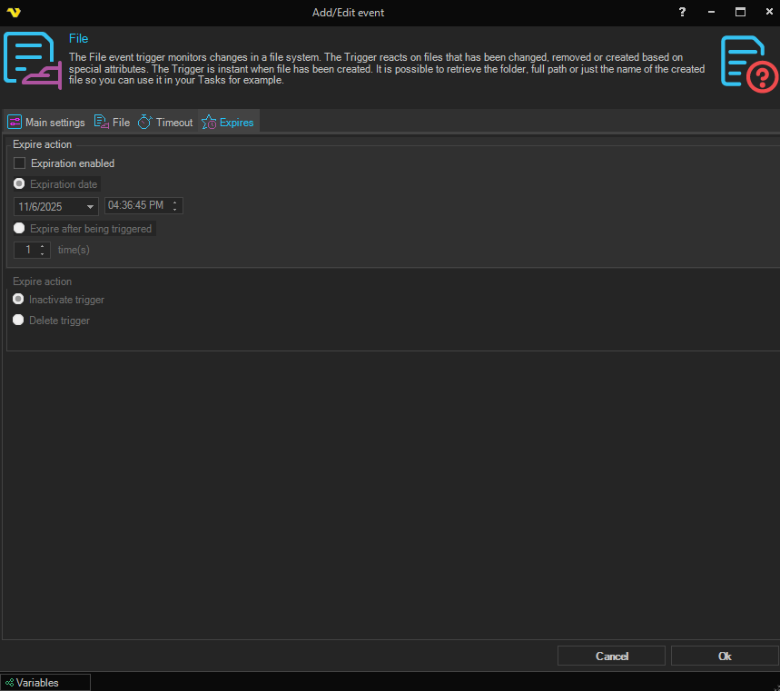 Check this option to enable an expiration type. You are able to set if a Trigger should be deleted or deactivated at a certain time or after a certain number of triggered times. Select either date or x time(s) the trigger has to fire before action.