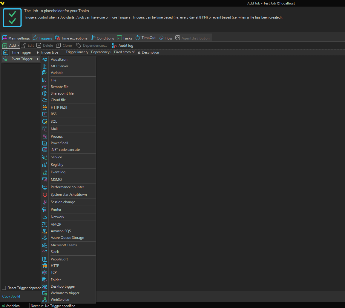 The event trigger is a complex and sensitive but also powerful way to monitor the system. Events in the system can trig your Job to run if that is the intention. An example is if your web server service dies and you want to know and act upon that.