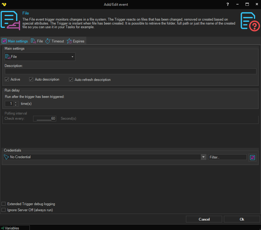 This value is only used by certain WMI events, otherwise grayed out. The polling interval defines how often VisualCron should check for changes in the system. Default is every 60 second. Setting it to a lower value than 10 will increase the load on the server. What's good is that you won't miss any events even though you are not checking it every second. Changes are stored and if something has happened you will be notified at your polling interval. What is important to know is that if you are watching for state "stopped" at a service and the service has started then stopped, any change has not occurred since the service was stopped in the first place. The service has to be started before monitoring a "stopped" change. Also, if the the service has started before monitoring and it turns from started to stopped within the polling interval no change is observed and you won't be notified.