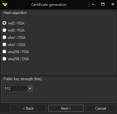 Select type of certificate (currently only Self-signed certificate).