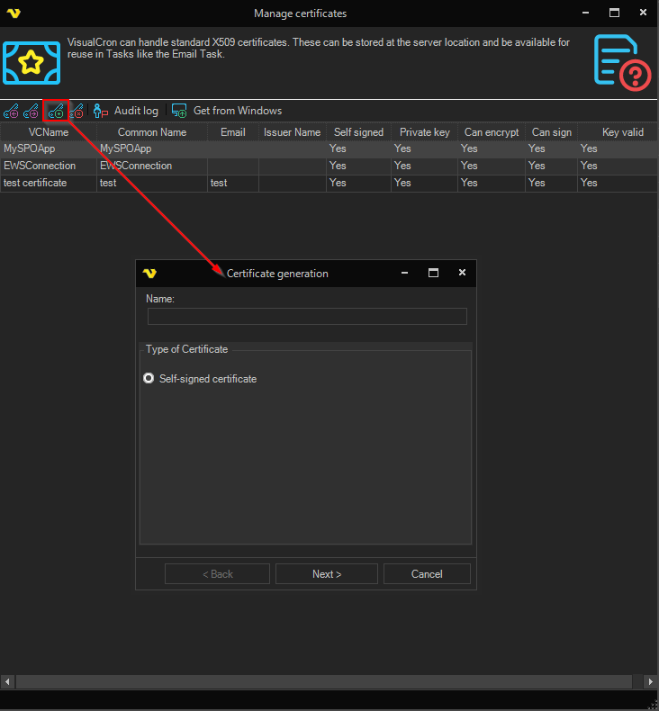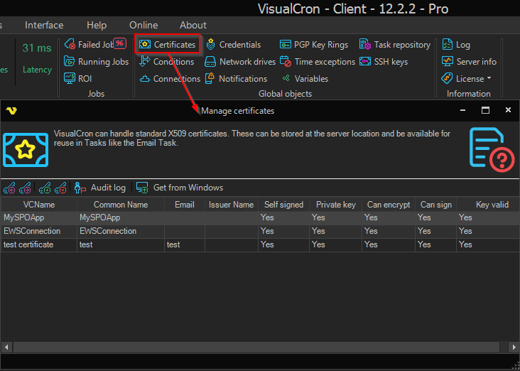 VisualCron can handle standard X509 certificates. These can be stored at the server location and be available for reuse in Tasks like the Email Task. The Manage certificates dialog is available in the main menu Server > Global objects > Certificates.