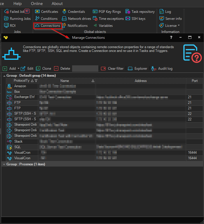 Connections are viewed and updated in the Server > Global objects > Connections window. The connections may also be managed by Add/Edit Job -> Tasks -> Add/Edit -> Task type. Connections are global, thus if you change a connection definition, this will affect all entities using this connection.