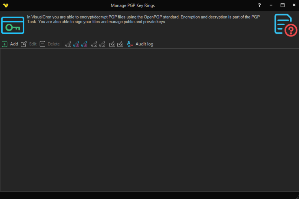 The PGP key rings are managed in the main menu Server > Global objects > PGP Key Rings dialog. Instead of pointing to public or private key files, VisualCron lets you generate or import this data and then centrally store it in VisualCron. A key ring is a set of keys, public or private. VisualCron wraps key rings in the manager. At a later stage, when you want to encrypt a file, you first select a VisualCron key ring and then the recipients or signers key from the same key ring.